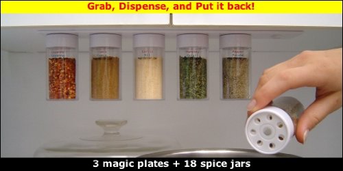 [Cooking Club of America - Member Tested & Recommended Seal of Approval] Magic Spicer is a self-sealing magnetic spice rack with spice jars. It is extremely simple to use: Grab, dispense, and put it back! Satisfaction guaranteed!! The patented invention complies with Health Canada and U.S. FDA Regulations. Length of the magic plate: 360 mm (14-1/8 in.), Width of the magic plate: 60 mm (2-3/8 in.), Interval between the magnets: 60 mm (2-3/8 in.), Height of each spice jar: 90 mm (3-1/2 in.), Diameter of each spice jar: 45 mm (1-3/4 in.), Volume of each spice jar: 90 ml (3 oz.)